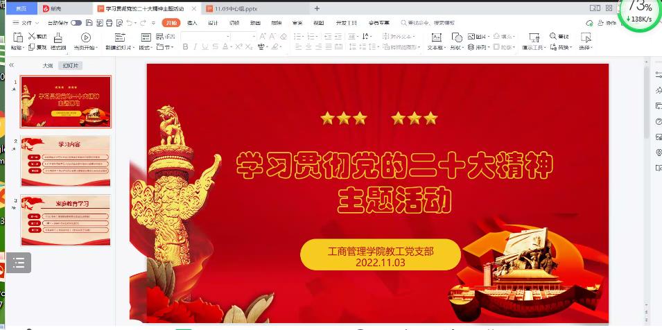 根据学校党委和学院党委的工作安排,2022年11月3日,beat365平台官方网站教工党支部在腾讯会议举行了学习贯彻党的二十大精神主题活动。