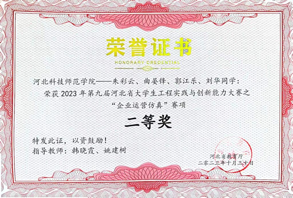 “工创赛”是学科专业交叉、校企协同创新、理工人文融通的高端工程创新赛事,由河北省教育厅主办,河北省高等学校工程训练教学指导委员会协办,其中“企业运营仿真”赛项决赛由来自全省高校的40支优秀队伍参赛。beat365官网白子浩等6名学生组成的2支队伍,在此次比赛中喜获佳绩。