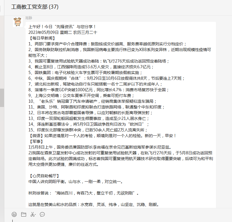 “先锋资讯”栏目包含新闻播报、心灵自助餐厅、党务百科等板块内容。让全体党员以快捷方式知晓天下新闻,心灵适时得到净化和引领,并且充实了党课教育的内容。各个板块之间内容交互融合,形成合力,全方位提升了党员老师的综合素质。此活动以微信群为载体,要求大家每天打卡学习,使得党员老师可以时刻关注活动的最新进展,学到先进的典型经验。通过互动学习,相互交流,激发了全体党员的学习热情。大家纷纷表示一定要用系统观念,在一体推进上持续用力,把学习和实干结合起来,推动beat365平台官方网站的工作走向高质量发展的新阶段。(编辑:景勤娟 审核:韩晓霞)