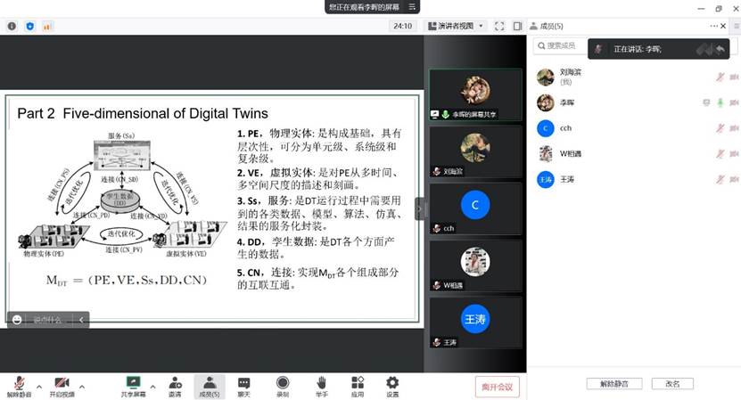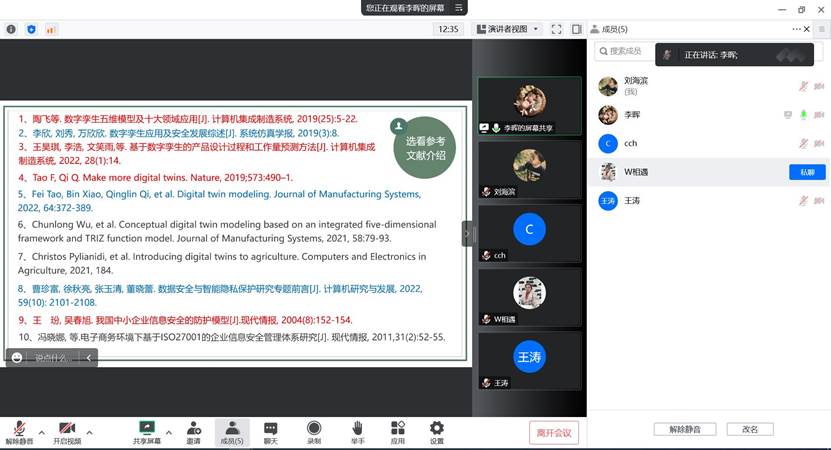 2022年11月3日下午,在刘海滨副院长的带领下,数字孪生与智慧管理科研团队通过腾讯会议如期开展了第二次讨论活动。首先,由李晖老师从自身研究内容出发,从近期所看的文献、数字孪生的五维概述、基于数字孪生五维解决企业隐私保护问题等多个方面进行了学习内容分享。之后,参会老师积极进行讨论,讨论内容包括:数字孪生目前面临的挑战、隐私信息保护的概念、及基于数字孪生思想在隐私保护方面存在哪些挑战等问题。最后,刘海滨副院长针对团队在数字孪生方面的学习及讨论,给出了充分的肯定,并激励团队成员奋发进取,继续砥砺前行,以二十大精神为旗帜,取得更多科研成绩。(撰稿人:李晖,审核人:刘海滨)