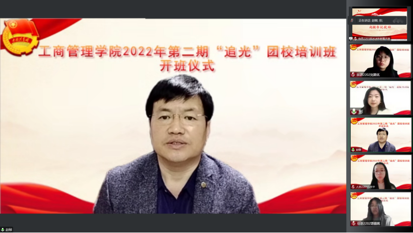 2022年10月27日,beat365平台官方网站团员相聚在云端举办2022年第二期“追光”团校培训班开班仪式暨第一次课程培训,学院党委书记、团委书记及团校学员参加开班仪式。