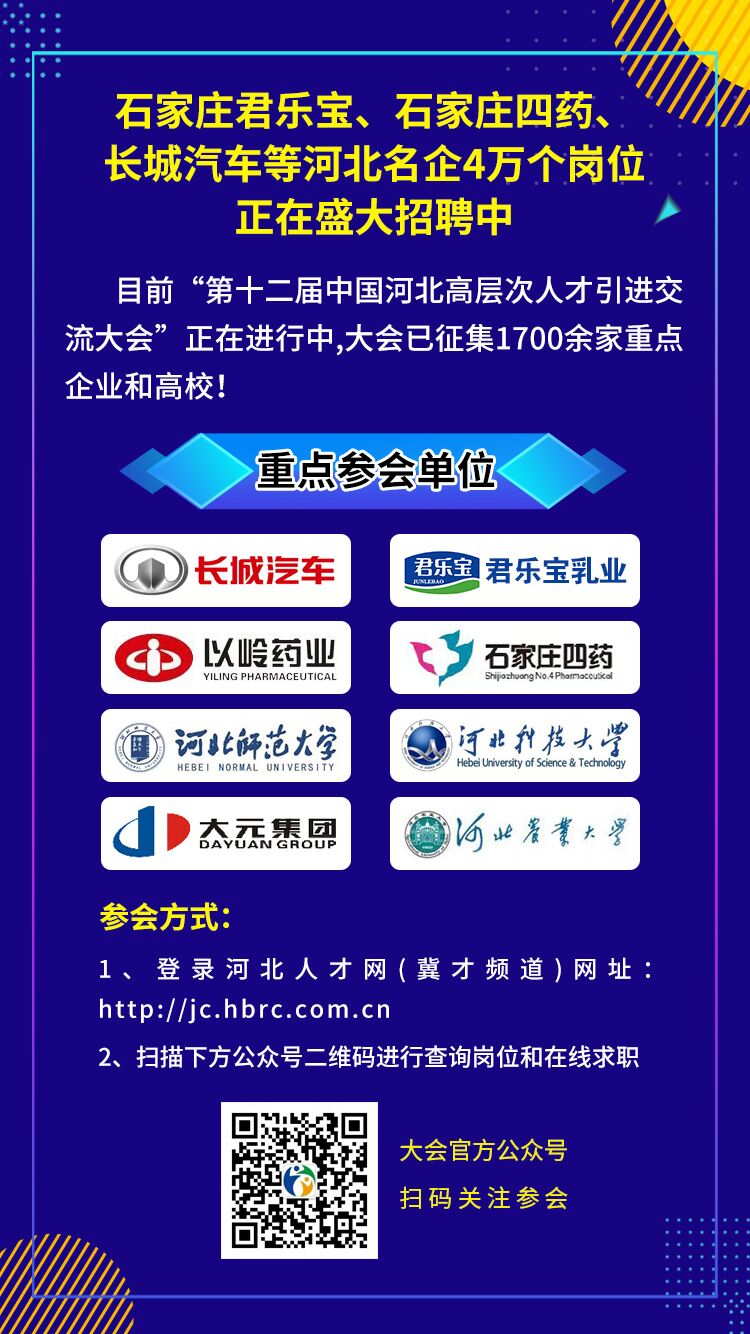 目前“第十二届中国河北高层次人才引进交流大会”正在进行中,石家庄君乐宝、石家庄四药、长城汽车、以岭药业等河北名企1700余家重点企业,4万个岗位正在盛大招聘中!请有意愿的毕业生学生投递简历,积极应聘。