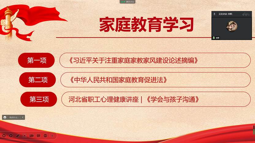 本次活动由beat365平台官方网站分工会主席韩晓霞主持。为了带动每个家庭培养良好的家风,韩晓霞主席带领大家共同学习《习近平关于注重家庭家教家风建设论述摘编》、《中华人民共和国家庭教育促进法》、《河北省职工心理健康讲座-学会与孩子沟通》等内容,引导大家树立良好的文明家风,文明育家、廉洁持家、学习兴家、绿色美家,培育向上向善的优良家风,以好家风涵养好社风。