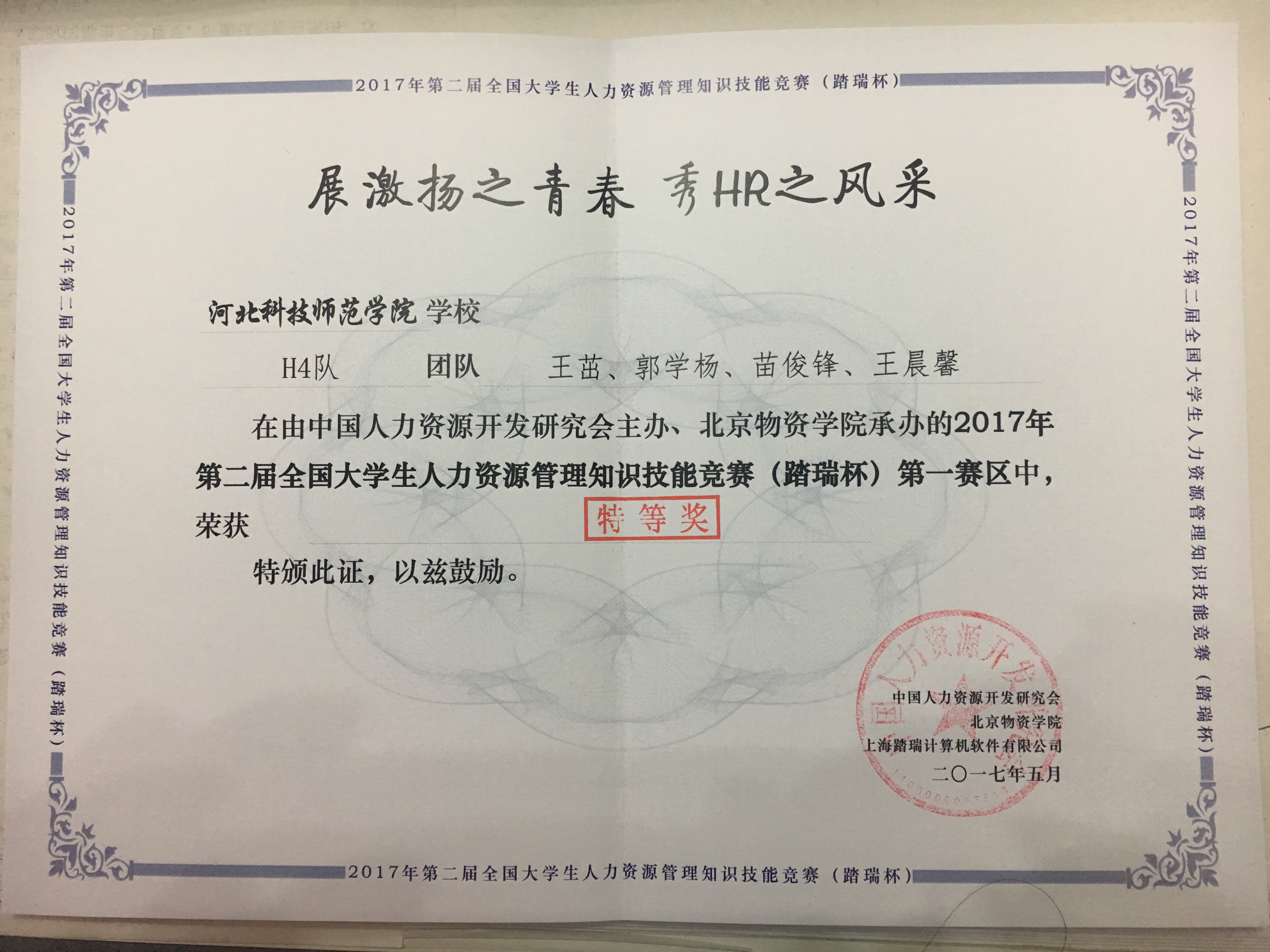 工商人资“H4”队,在“第二届踏瑞杯人力资源管理知识技能竞赛第一赛区(华北区)”的比赛中,与来自北京、天津、河北、山东、山西、内蒙古六省市的42支队伍经过方案设计环节、现场对抗环节、现场答辩环节层层考验,脱颖而出,获得第一名的好成绩,拿到本次区域赛的特等奖,以优异的成绩成功晋级国赛。