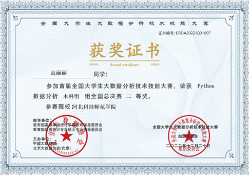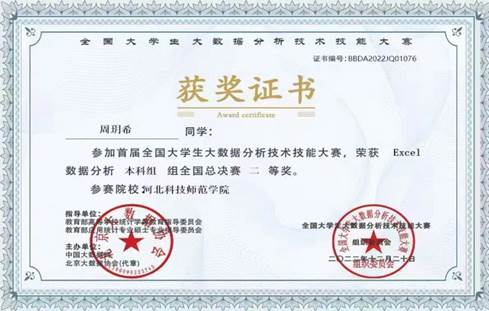 该项比赛是在教育部高等学校统计学类教育指导委员会、教育部应用统计专业硕士专业指导委员会的共同指导下,由中国大数据网联合北京大数据协会联合启动。大赛包括Excel数据分析和Python数据分析两项赛项,周玥希、高丽丽两位同学在2022年11月举行的该项大赛省赛中获得一等奖,取得了参加全国赛的资格。现代表beat365官网在该项大赛全国总决赛中取得佳绩,可喜可贺。(撰稿人:柴朝华,审核人:刘海滨)