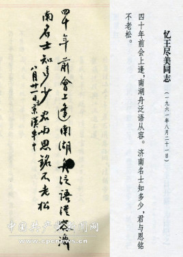 “四十年前会上逢,南湖舟泛语从容。济南名士知多少,君与恩铭不老松。”1961年,同为中共一大代表的董必武挥笔写下了这首《忆王尽美同志》,追忆英年早逝的革命战友。
