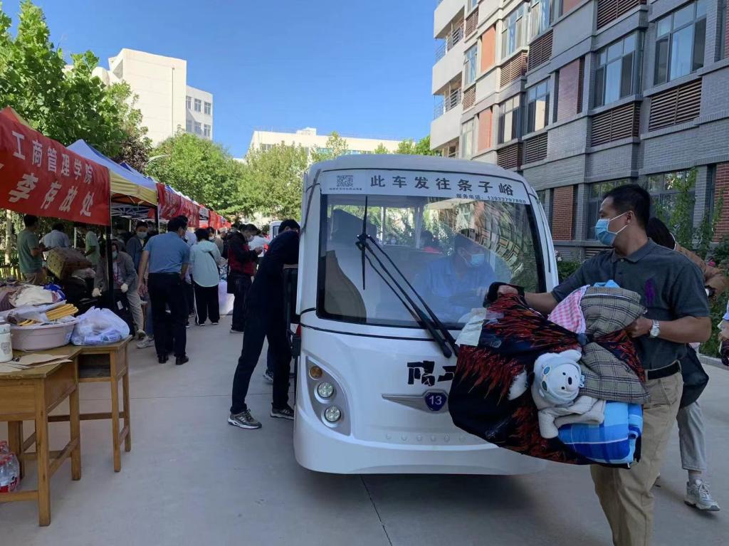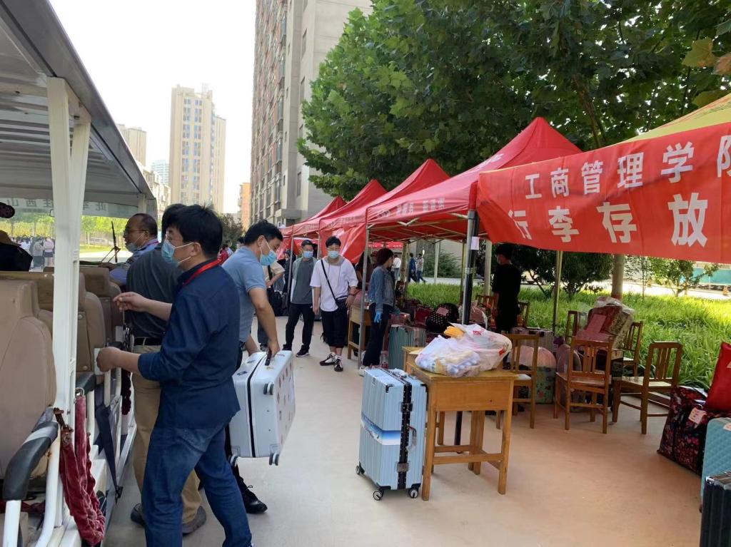 行李摆渡车到站后,党员志愿者迅速从车上卸下本学院学生的行李,然后按照之前的责任分工,分流到各个专业所属“领地”,方便各专业学生报到后能够快速认领。行李过多的情况下,党员志愿者用搬运车帮助学生一起把行李运到宿舍。工商行李站、宿舍区到处是党员老师们来来回回忙碌的身影。不知不觉到了中午,老师们急匆匆扒拉两口盒饭,继续配合“快节奏”的行李摆渡车。虽然大家身体有些疲惫,但每个人脸上都洋溢着快乐的笑容。