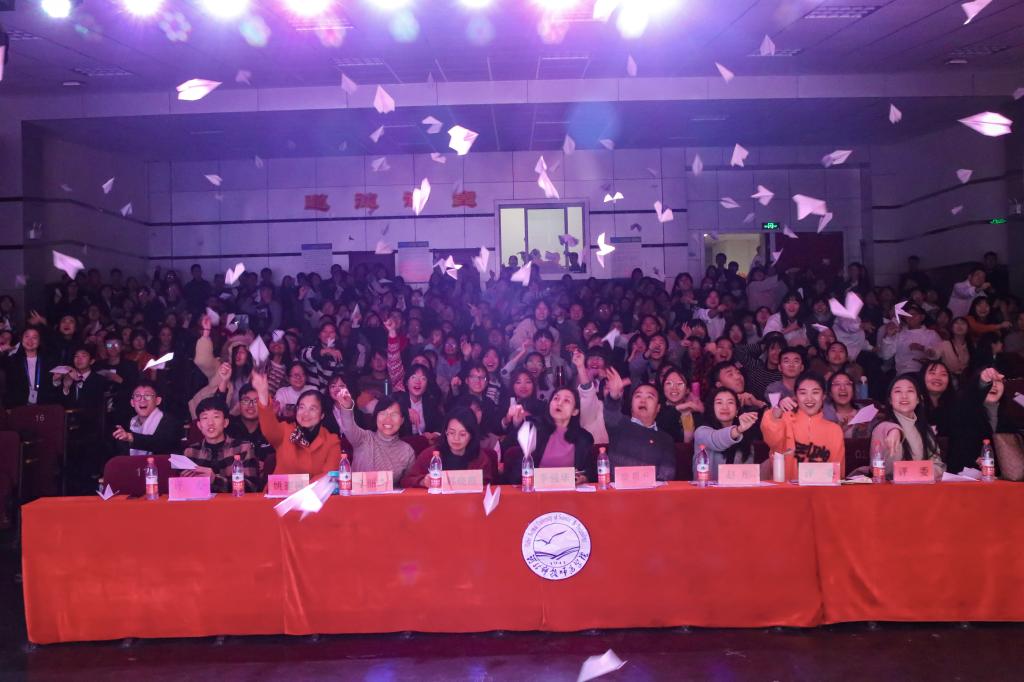 观众互动环节,同学们亲手折出300多只纸飞机,300多名师生在上面写出自己的初心和梦想,一起将纸飞机放飞舞台的中央,纸飞机承载着初心,让梦想起航,学生工作负责人与现场同学分享了自己的初心和梦想,她说,同学们平安健康乐观向上,在大学校园拼搏奋进就是她最大的梦想,希望同学们以梦为马,放飞青春的梦想,所有的老师都是你们的护航者和引路人。大赛最后,当《不忘初心》的乐曲响起,全场师生全体起立挥动手中的光亮,共同唱响:“不忘初心,继续前进,万水千山最美中国道路……”,大赛在浓郁的家国情中结束。